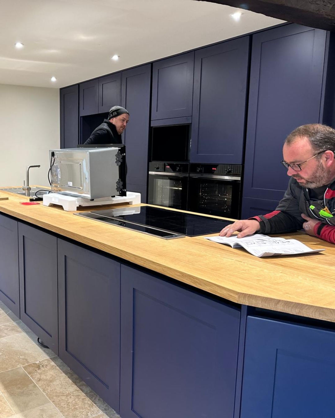 The oak worktop and table bring warmth and authenticity, while the royal blue accent adds a strong design identity to this contemporary kitchen.