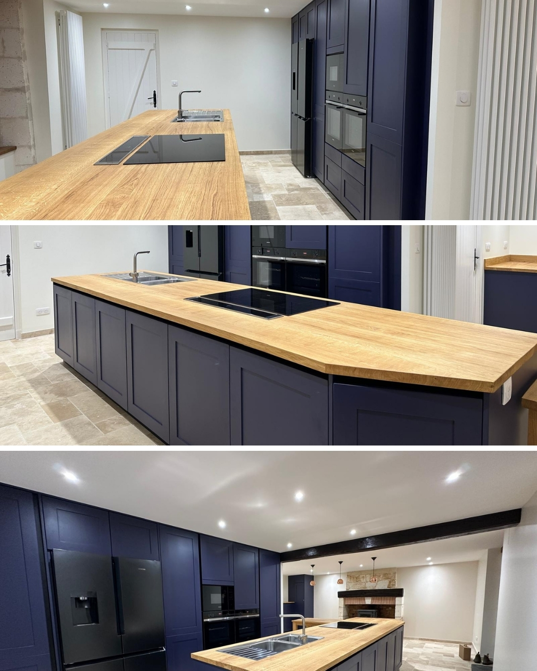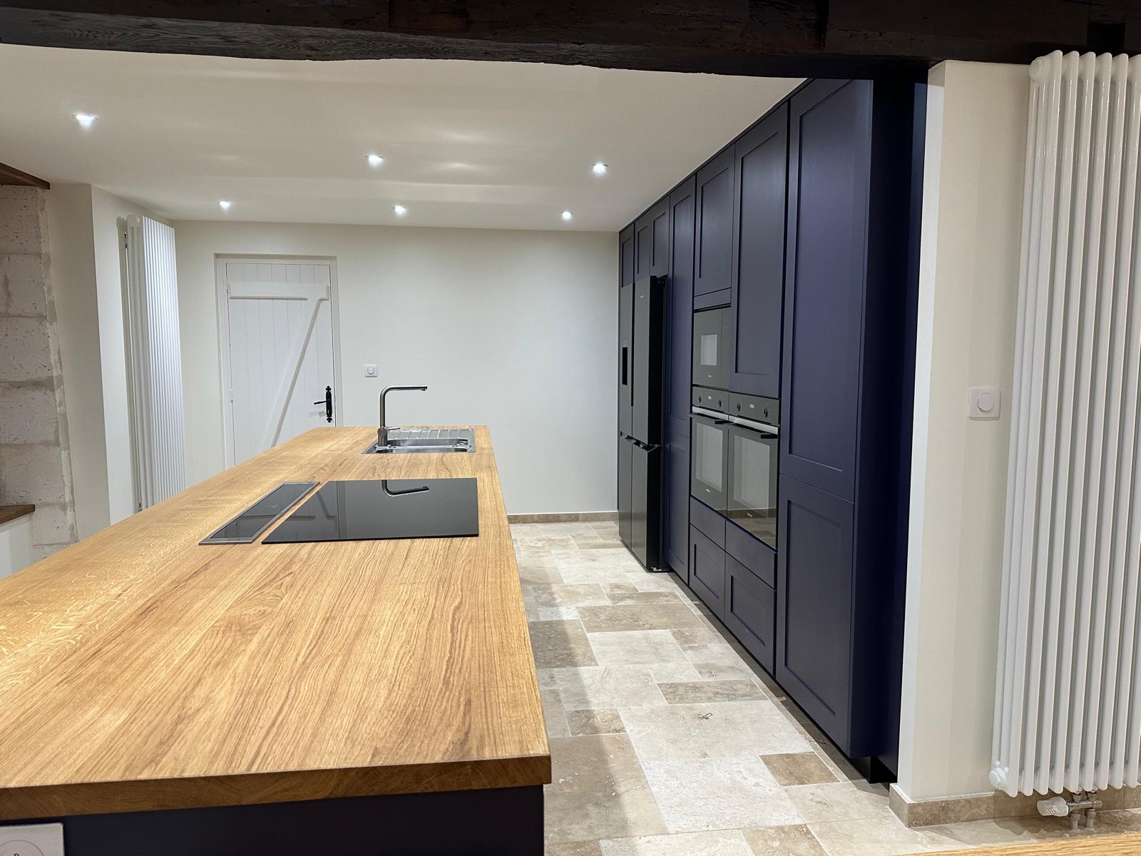 Le plan de travail et la table en chêne apportent chaleur et authenticité, tandis que la touche de bleu roi affirme le caractère et le design de cette cuisine contemporaine.