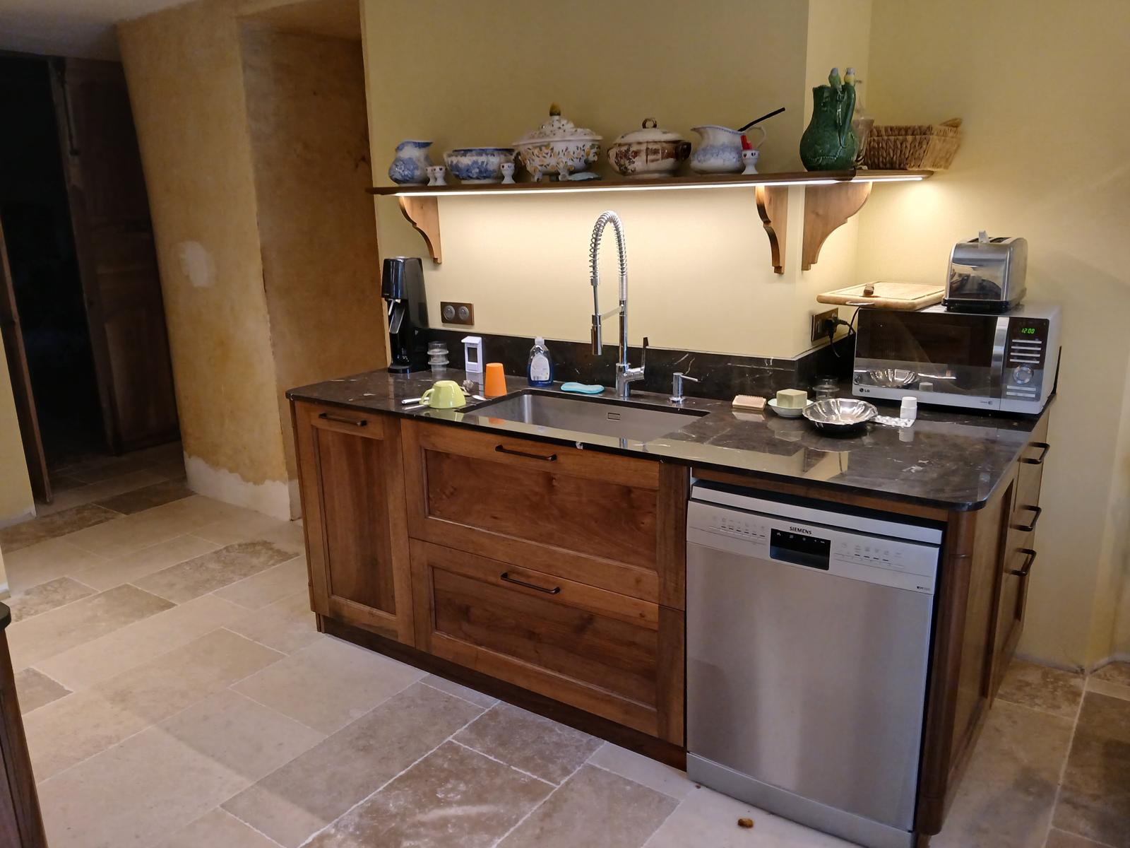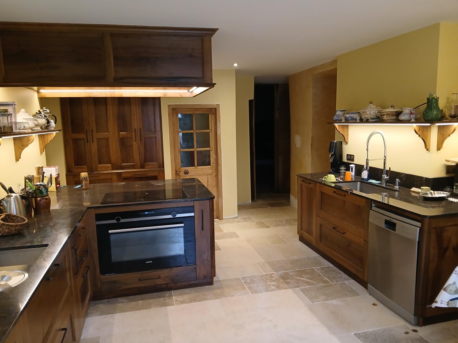 - Façades en noyer sublimées par une finition chêne moyen et un vernis qui fait ressortir toute la richesse du bois.